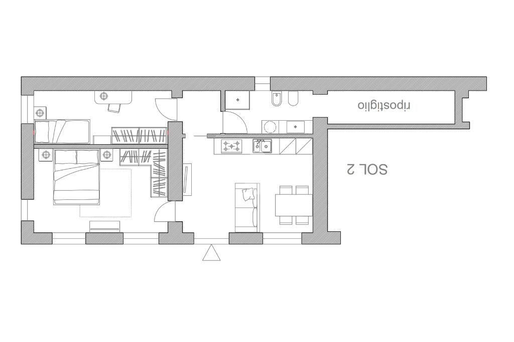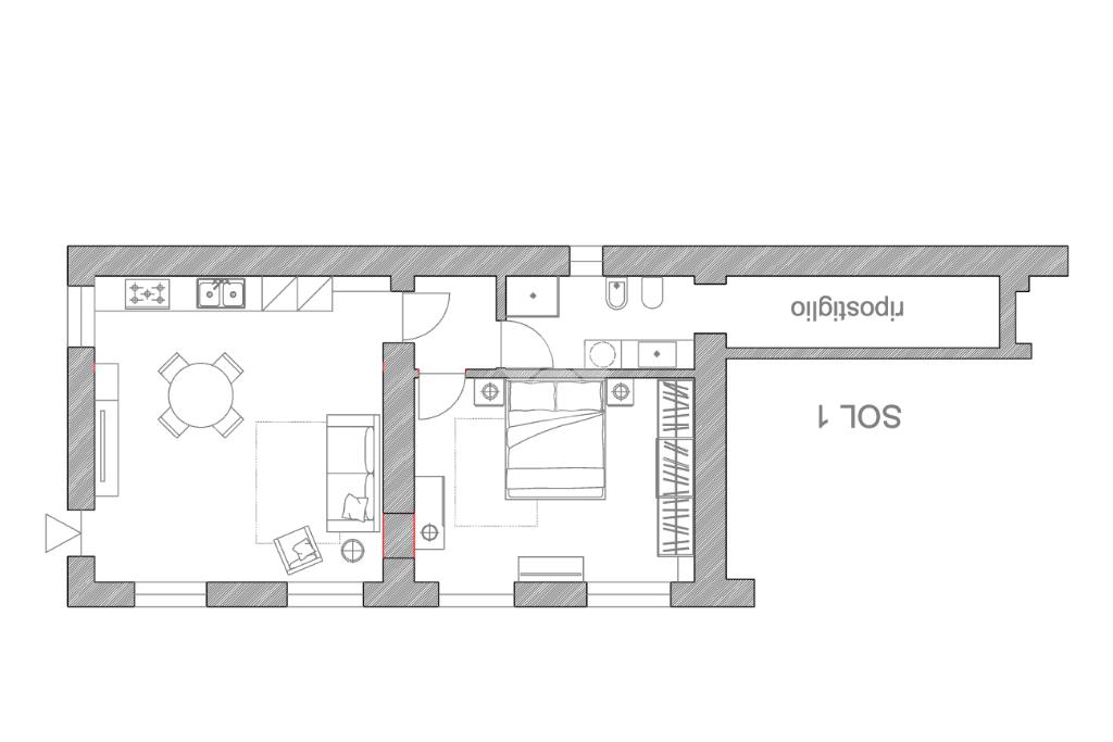 L'ingresso principale apre direttamente su un'accogliente e spaziosa zona giorno living con cucina a vista, concepita come il fulcro conviviale della casa. Il layout attuale si completa con un ampio bagno finestrato, servito da un moderno box doccia, e una generosa camera da letto matrimoniale caratterizzata da dimensioni sopra la media.